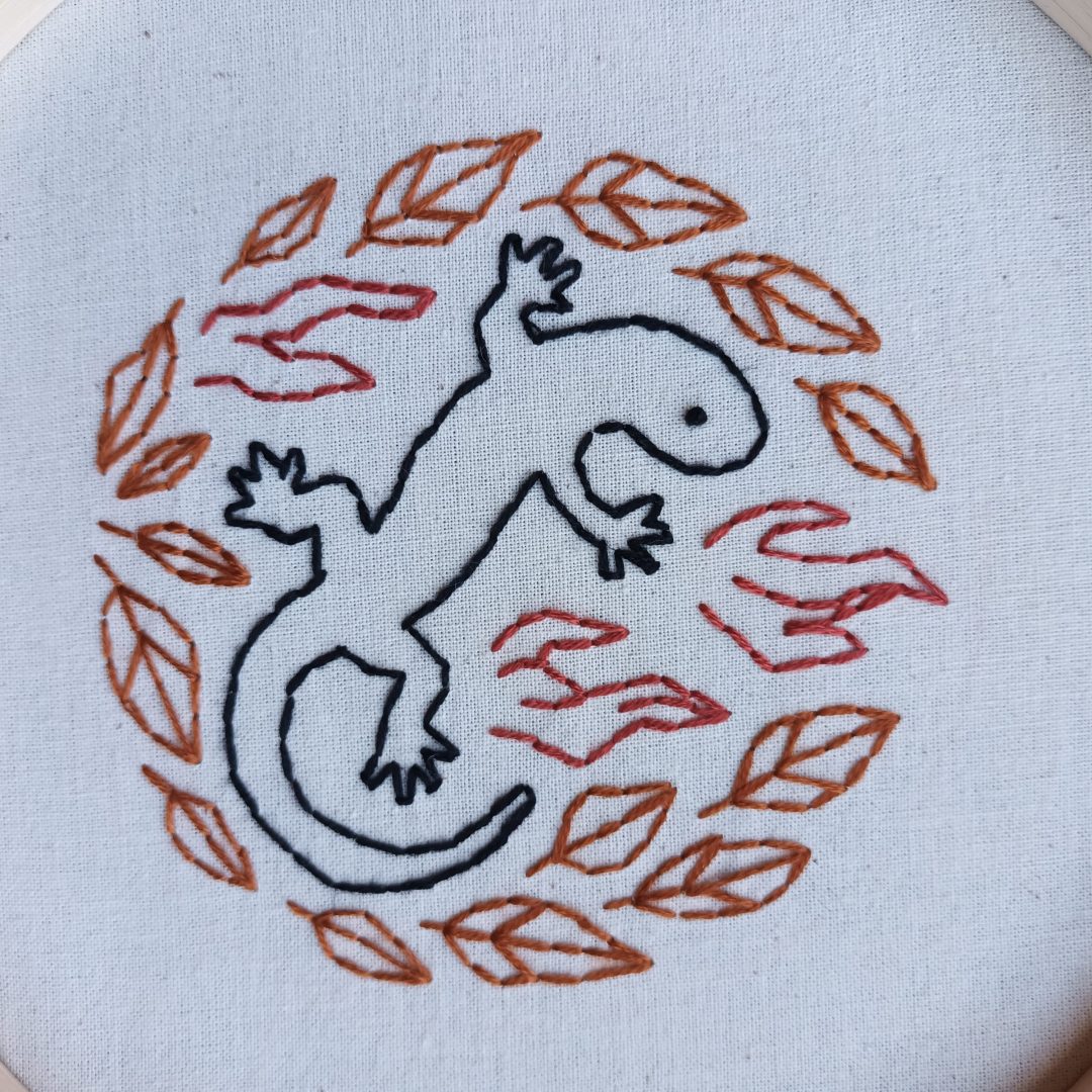 - Brodez les contours de la salamandre et de la couronne végétale.