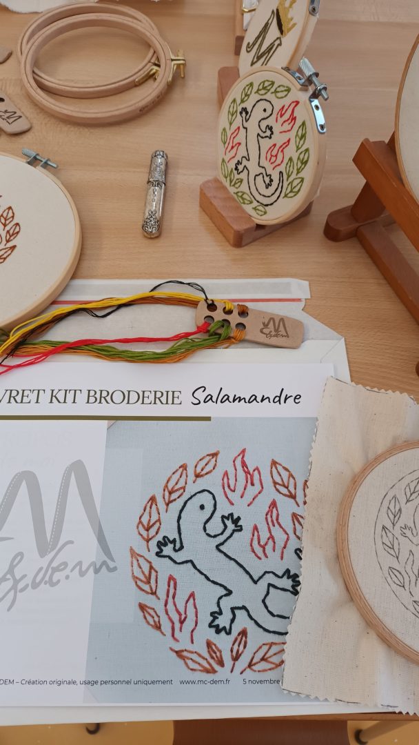 Découvrez le kit broderie Salamandre, inspiré du patrimoine de Villers-Cotterêts, créé pour les 5 ans de MC&DEM. Tambour, fils et livret inclus pour broder à votre rythme.