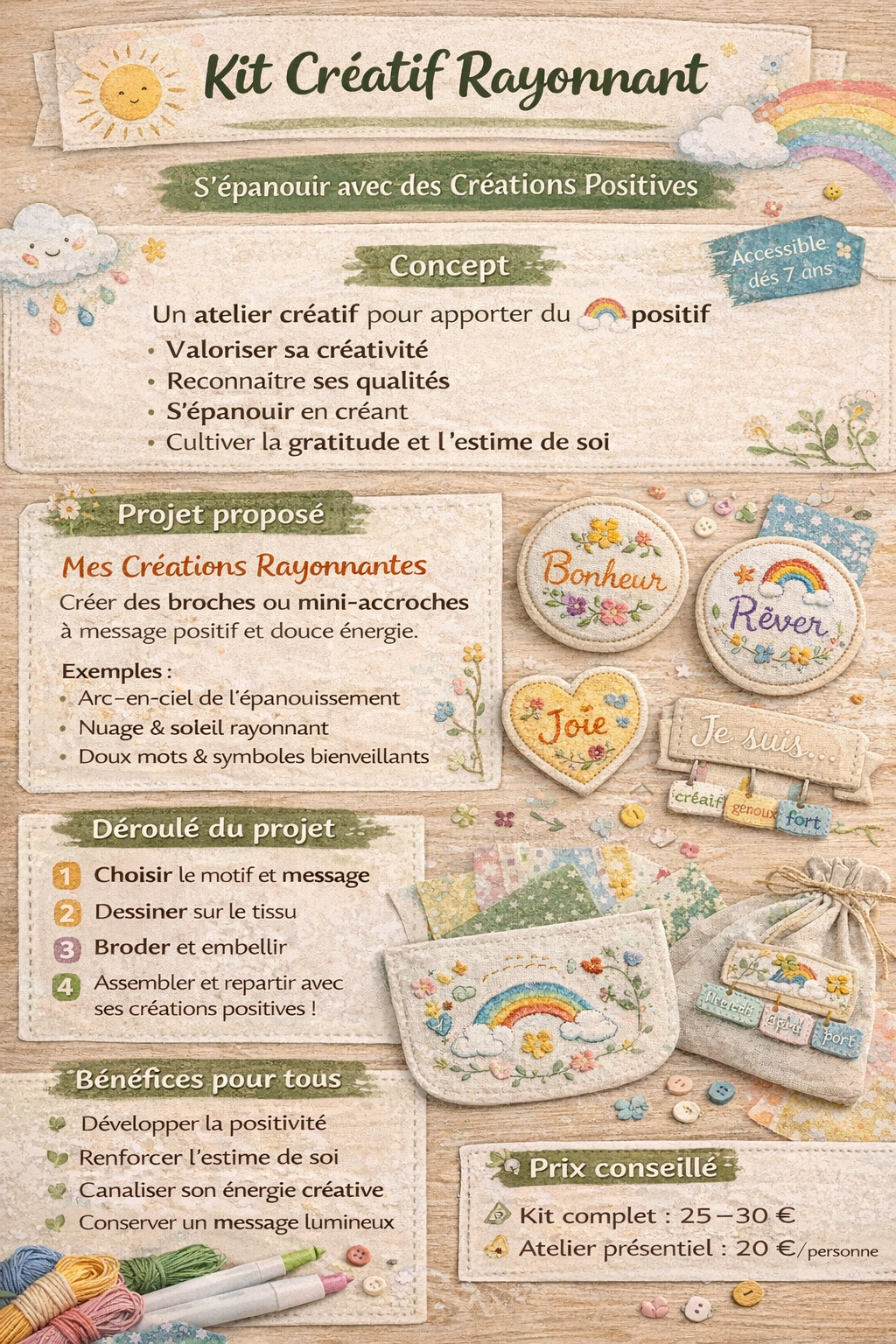 Le Kit Créatif Rayonnant MC&DEM est pensé pour tous ceux qui souhaitent vivre un moment méditatif, inspirant et joyeux autour de la création textile. Ce kit invite à expérimenter les couleurs, les textures et les motifs, tout en développant patience, motricité fine et plaisir du geste.